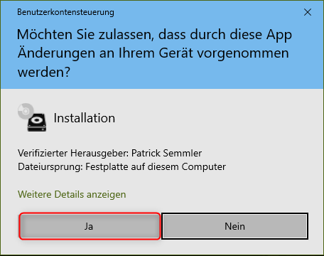 - Nachdem Sie die heruntergeladene Programmdatei ausgeführt haben, erscheint ein Dialogfenster von der Benutzerkontensteuerung: