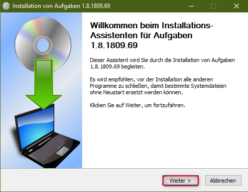 Klicken Sie in diesem Dialog bitte auf „Ja“. - Nun erscheint das Installationsprogramm von Aufgaben. Klicken Sie im Begrüßungsfenster bitte auf „Weiter“: