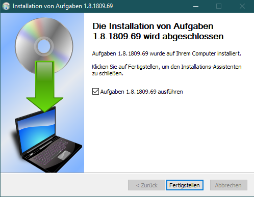 - Nun wird die Installation durchgeführt. Nach Ende der Installation können Sie Aufgaben direkt starten lassen, nachdem auf Fertigstellen geklickt wurde: